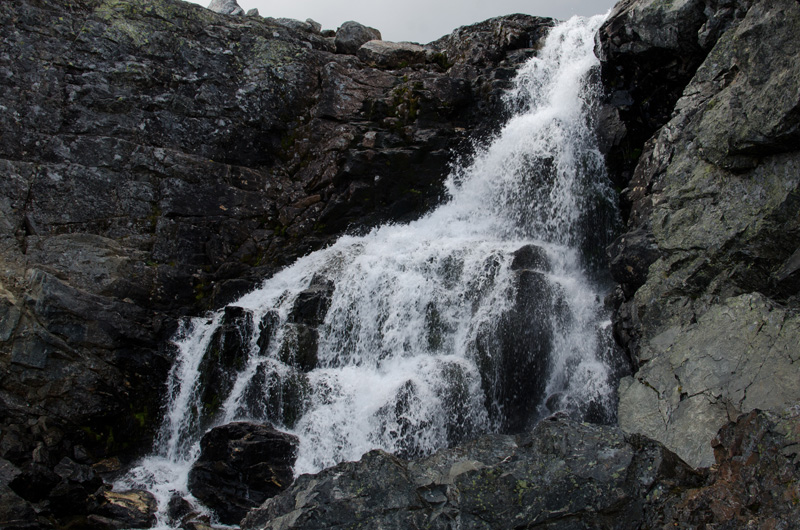 Myös pitsusjoen ylitys onnistui vaelluskengillä kahlaten. Sitten alkoikin nousu kohti Kovddoskaisin satulaa puronviertä seuraten. Kartasta olin etukäteen katsellut, että Marfejoessa olisi putous. Ja niinhän siellä olikin, vieläpä hyvin näyttävä sellainen.